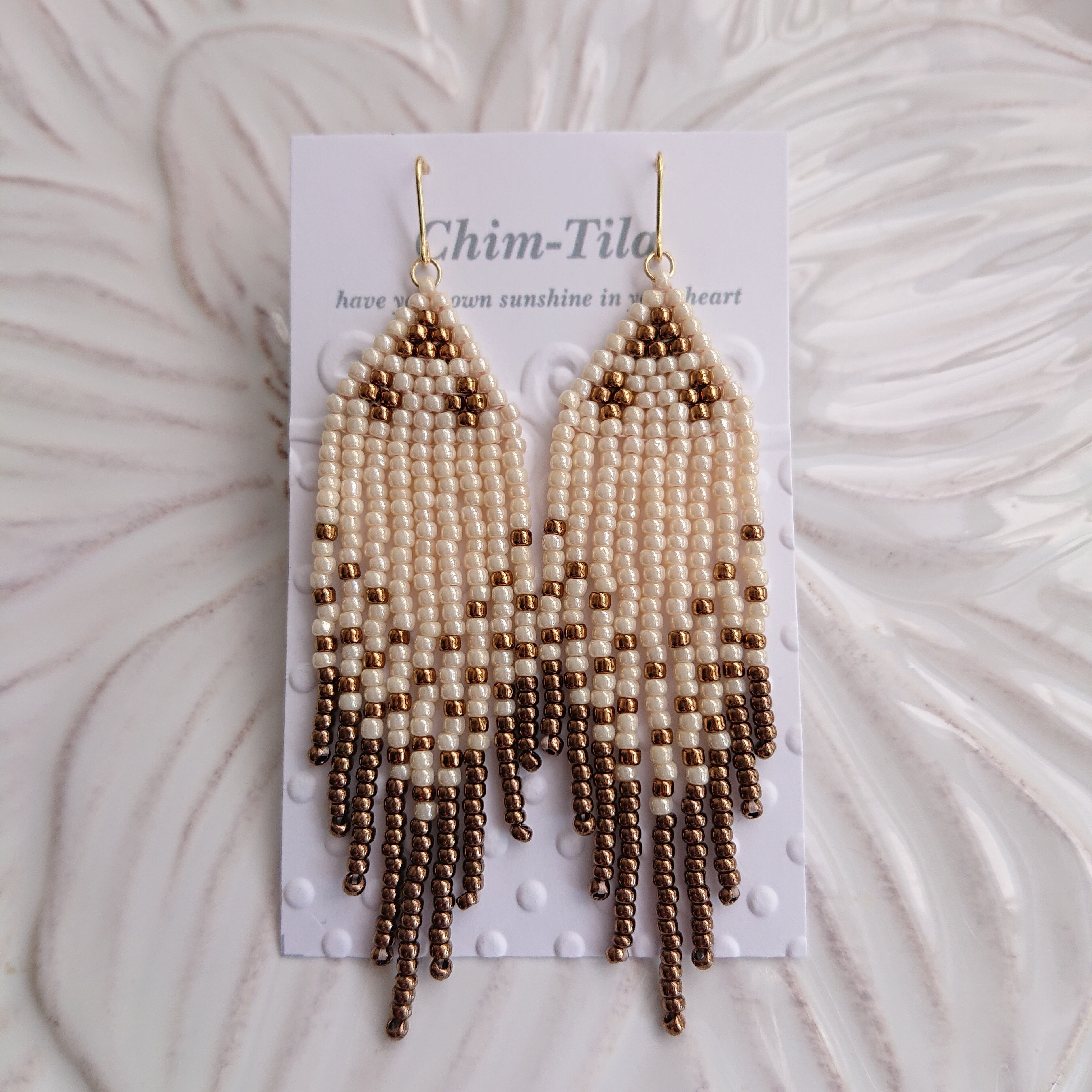 しなやかで丈夫なビーズステッチ用の糸で、ビーズを一粒一粒丁寧に編んでいます。シードビーズは大きさや形が一粒ずつ微妙に違っていて、個性をもっております。そのため商品の仕上がりに個体差(若干の凹凸や歪み)がありますが、そのニュアンスも商品のデザインとして販売しています。